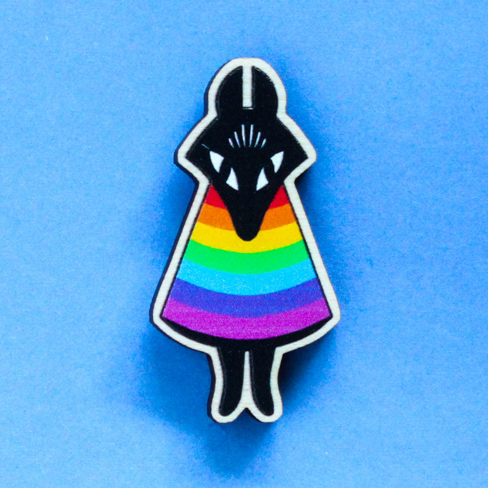 Printed on 3mm thick maple. Single pin with a rubber clutch.