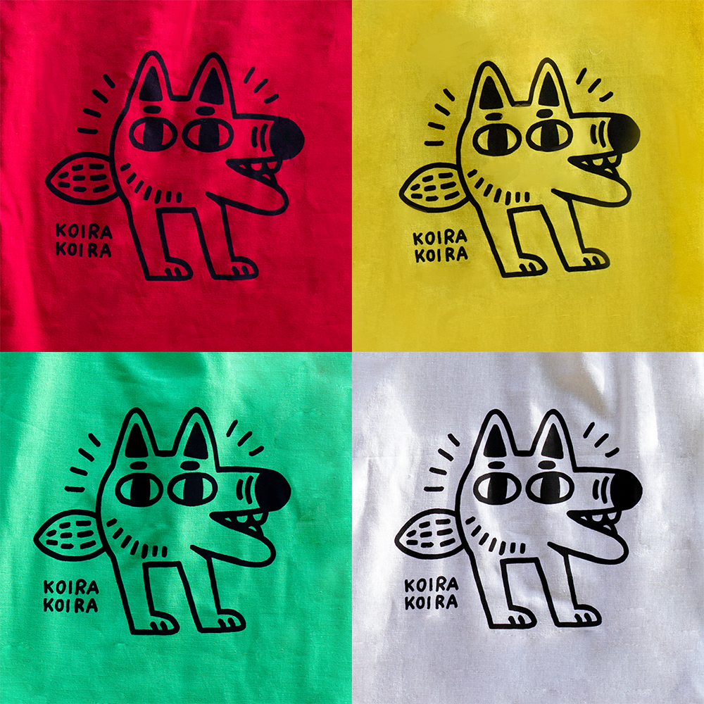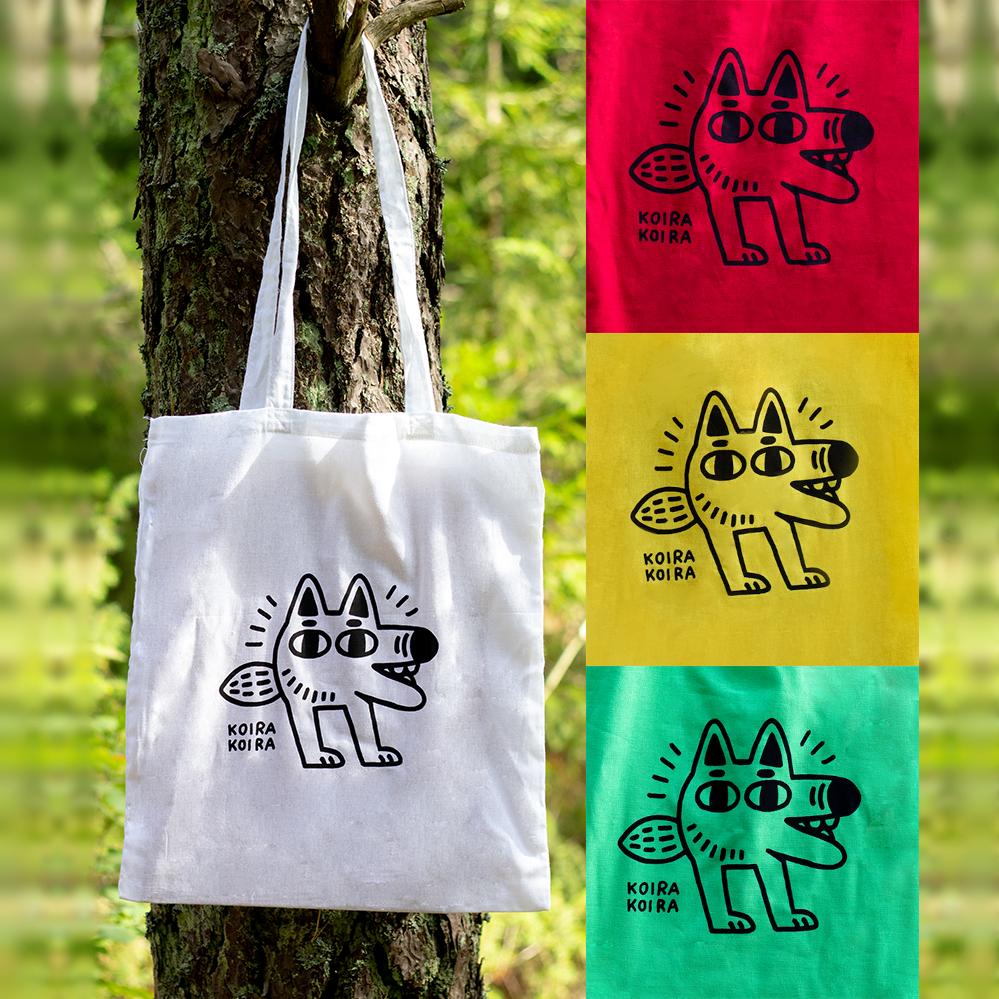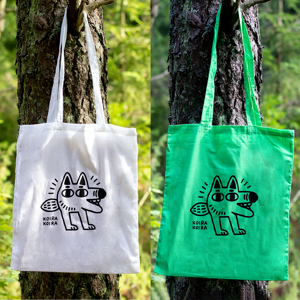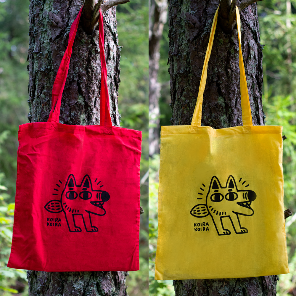 Now you can take Koirakoira with you anywhere! Measures 36 cm x 41 cm (14'' x 16'') with a 36 cm (14'') strap. 100% cotton.