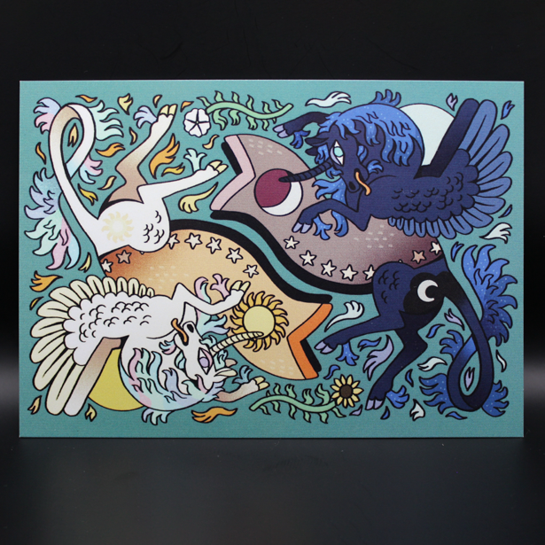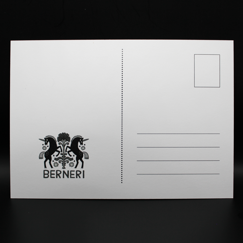 Postcards are printed on semi-glossy 250gsm cardboard.