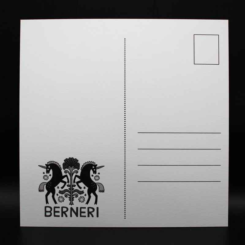 Postcards are printed on semi-glossy 250gsm cardboard.